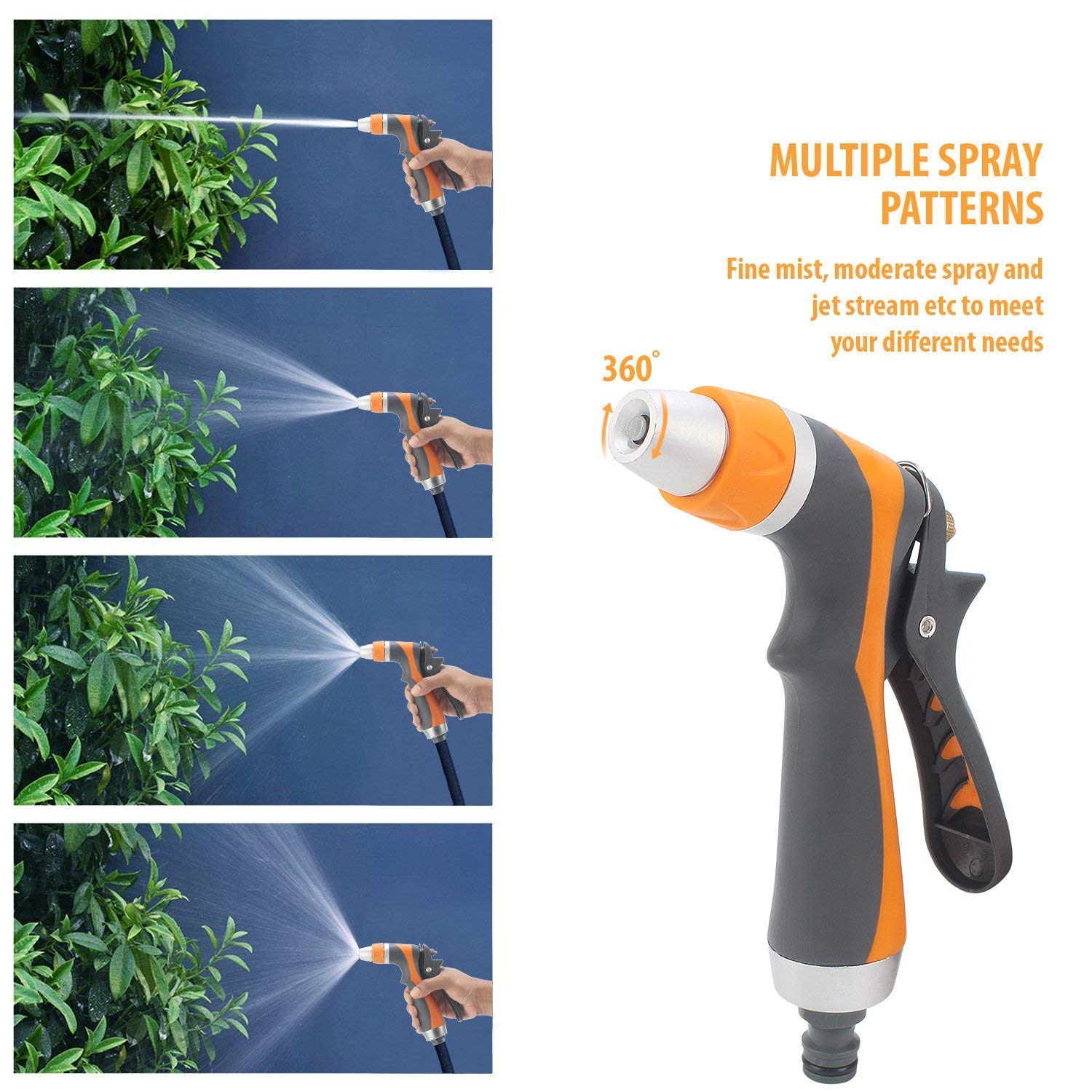 4. Boquilla de manguera de jardín. Material: Cuerpo de plástico con revestimiento suave de TPR, conector de entrada de aluminio con cabezal de aluminio.